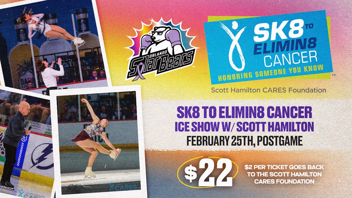 ORLANDO, Fla. — The Orlando Solar Bears announced today Olympic Gold Medalist Scott Hamilton and his charity figure skating program, "Sk8 to Elimin8 Cancer" will be performing following Sunday afternoon's Hockey Fights Cancer game between the Solar Bears and the Atlanta Gladiators on February 25. Puck drop is scheduled for 3:00 p.m. with the ice show to begin shortly after the conclusion of the hockey game.